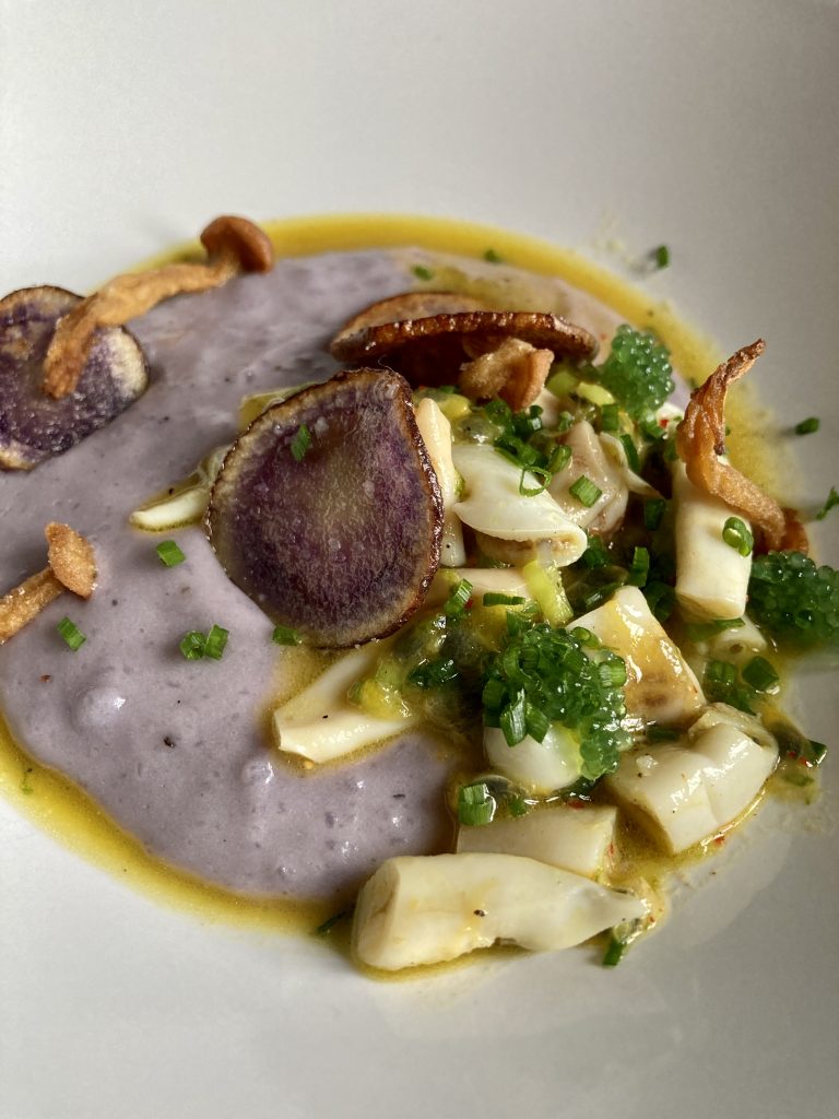 Pour la finition, fais quelques chips de vitelottes. Coupe des rondelles fines à la mandoline et plonge-les dans de l’huile végétale jusqu’à ce qu’elles soient bien croustillantes et dorées. Tu peux les faire au four : un filet d’huile d’olive et au four, position grill à 200 °, surveille. Prends des petits champignons Shimeji. Pass-les dans la farine. Et Fais-les frire. J’avoue j’ai aussi rajouté quelques oeufs de poisson au wasabi. Il m’en reste encore. Si tu me suis ça vient de la recette d’huîtres panées. Tu peux aller checker.