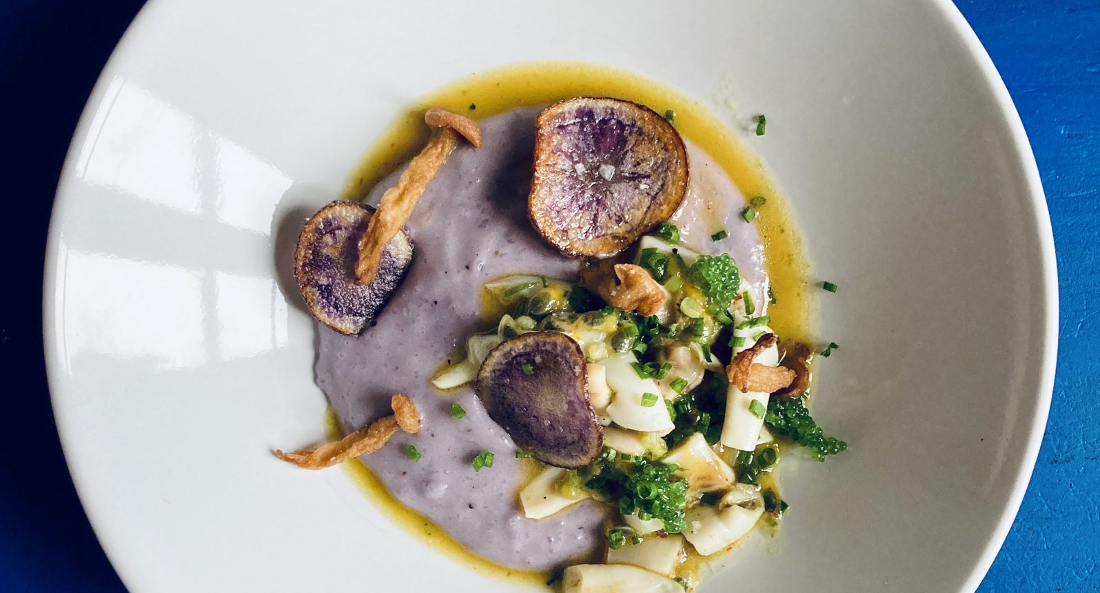 Pour la finition, fais quelques chips de vitelottes. Coupe des rondelles fines à la mandoline et plonge-les dans de l’huile végétale jusqu’à ce qu’elles soient bien croustillantes et dorées. Tu peux les faire au four : un filet d’huile d’olive et au four, position grill à 200 °, surveille. Prends des petits champignons Shimeji. Pass-les dans la farine. Et Fais-les frire. J’avoue j’ai aussi rajouté quelques oeufs de poisson au wasabi. Il m’en reste encore. Si tu me suis ça vient de la recette d’huîtres panées. Tu peux aller checker.