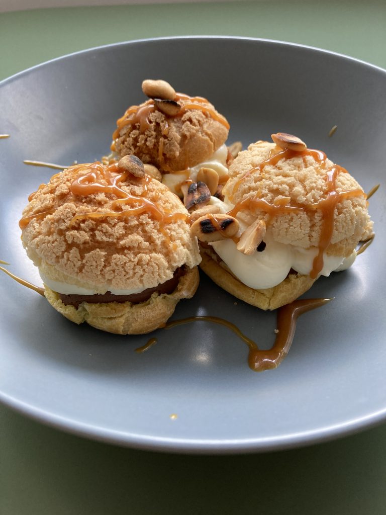Pour la présentation : Ouvre les choux au couteau à dents. Poche avec une des ganache, puis dispose au centre le mélange cacahuète/caramel, puis l’autre ganache. Referme avec le chapeau. Verse du caramel fondant dessus et parsème de cacahuètes torréfiées (à la Salt Bae pour plus d’originalité hahaha).