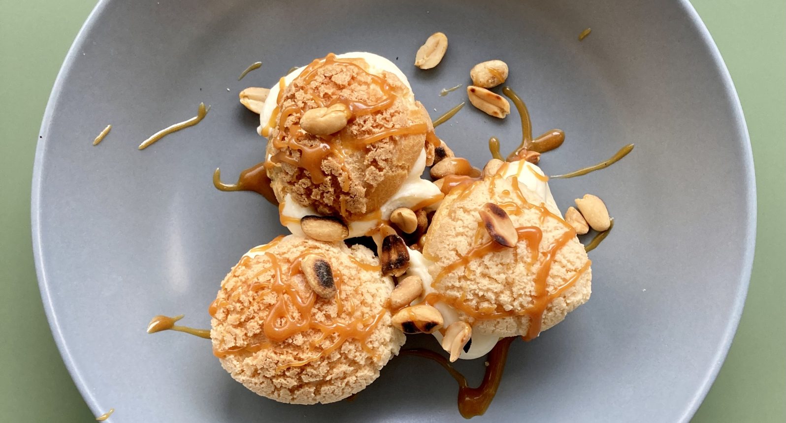 Pour la présentation : Ouvre les choux au couteau à dents. Poche avec une des ganache, puis dispose au centre le mélange cacahuète/caramel, puis l’autre ganache. Referme avec le chapeau. Verse du caramel fondant dessus et parsème de cacahuètes torréfiées (à la Salt Bae pour plus d’originalité hahaha).