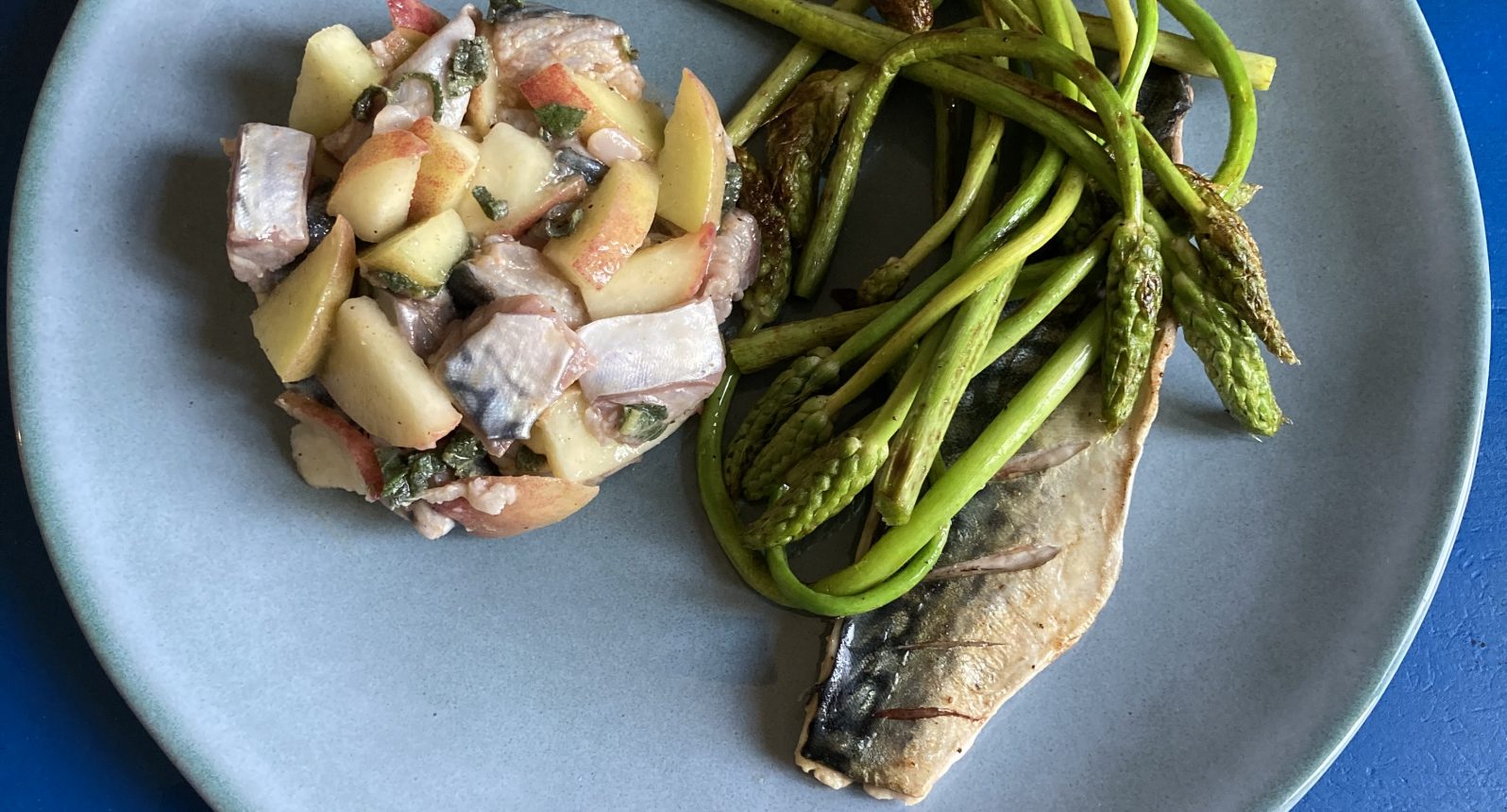 Dans une poêle, fais chauffer un filet d’huile d’olive avec une noisette de beurre. Quand c’est bien chaud, jette les asperges préalablement lavées. Sale, poivre. Fais-les sauter 3-4 minutes. Puis baisse le feu à moyenne intensité. Laisse cuire genre 5 minutes. Là, prends tes 2 filets. Sale et poivre de chaque côté. Fais des entailles côté peau. Décale les asperges sur le côté de la poêle et pose les filets côté peau. Les filets vont cuire très vite avec la chaleur résiduelle de la poêle. Au bout de 2 minutes. Eteins le feu. Retourne les filets délicatement. Le temps de préparer ton assiette, ils vont finir de cuire.
