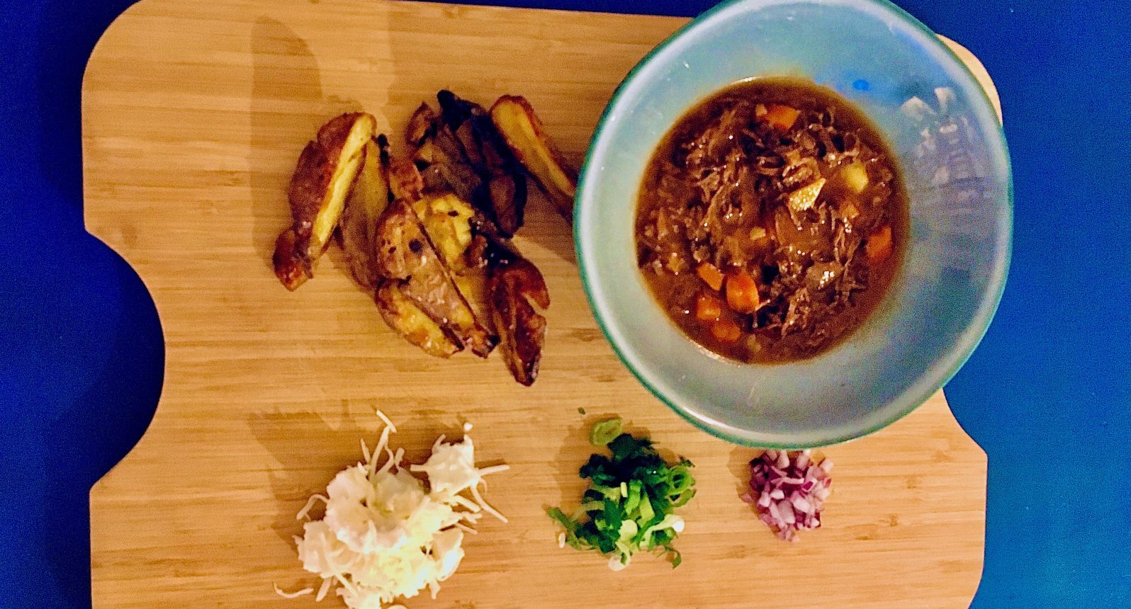 Ecoute, tout se joue sur le ragout de boeuf finalement. Dans une sauteuse, mets un peu d’huile végétale et une noisette de beurre, saisis à feu vif, la pièce de boeuf que tu auras préalablement assaisonnée avec du sel et du poivre. Dès que c’est bien coloré de chaque côté même les tranches, baisse à feu moyen et rajoute l’oignon, et l’ail ciselés, et la carotte en dés. Laisse saisir quelques minutes, puis ajoute le concentré et déglace avec la bière (c’est facultatif ça). Enfin, dilue le fond de veau dans l’eau tiède, et verse. Tu peux me juger, je n’ai pas fait le fond de veau mais là on est parti sur de la street food, en vrai ça fait facilement l’affaire. On part sur 6 heures au moins (tu peux aller grave à 10 heures) à feu doux et à couvert.
