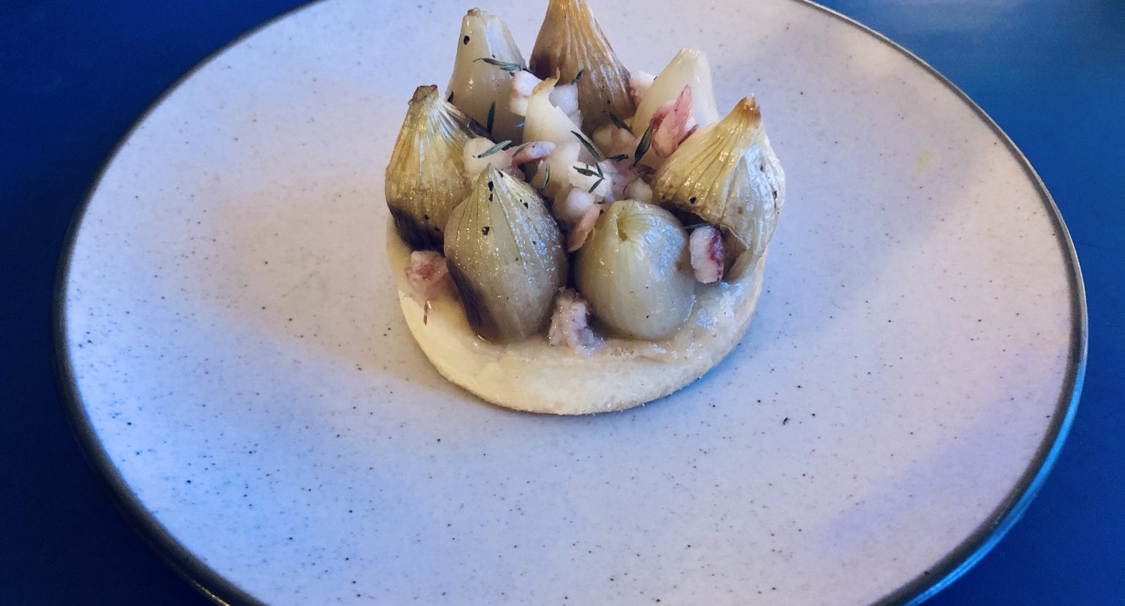 Pour la présentation : Sur le fond de tarte, dépose de la compotée d’oignons, puis de la brunoise poires/anguille. Dispose ensuite les oignons grelots farcis avec la gelée de poire. Parsème par encore plus de brunoise, quelques feuilles de thym frais. Et C’est CARRé. A manger tiède.