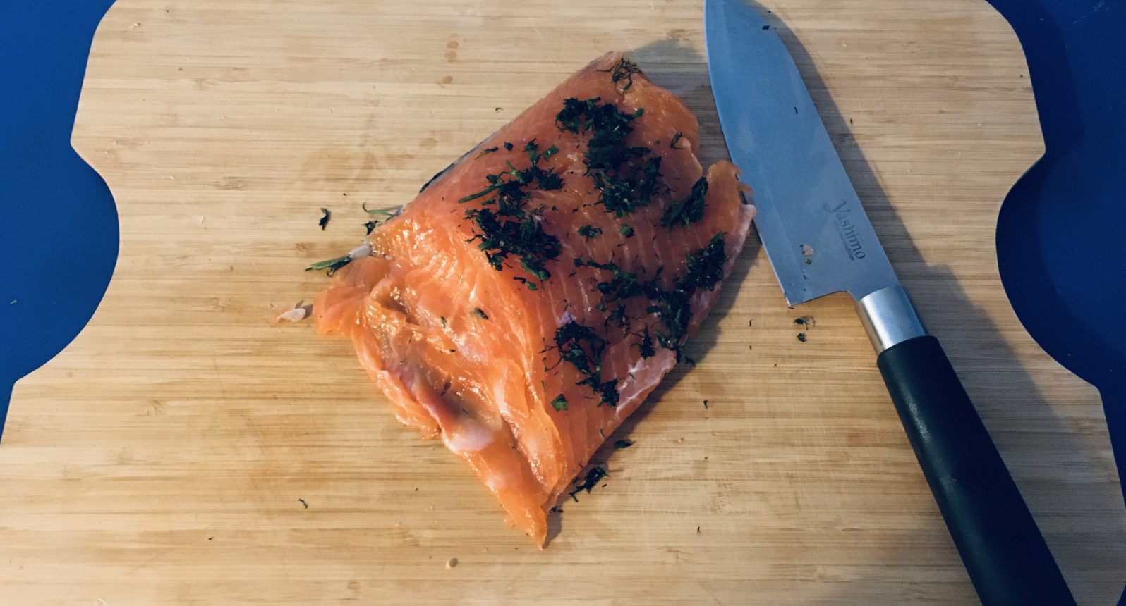 Immerge ton pavé en mettant le mélange sel sucre au dessus et en dessous, ferme ton plat hermétiquement avec du film alimentaire et laisse ton saumon cuire au moins 10h au frigo.