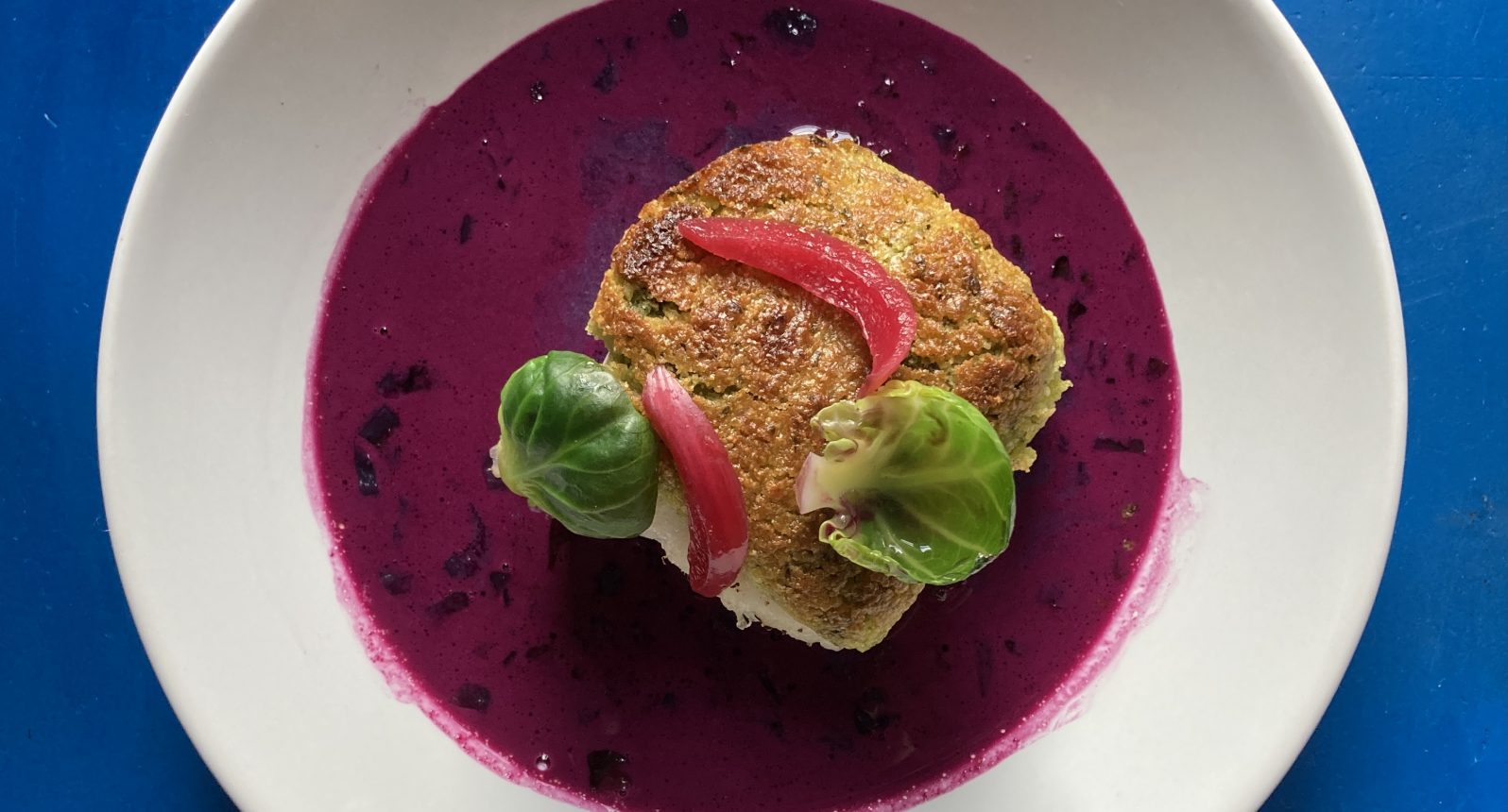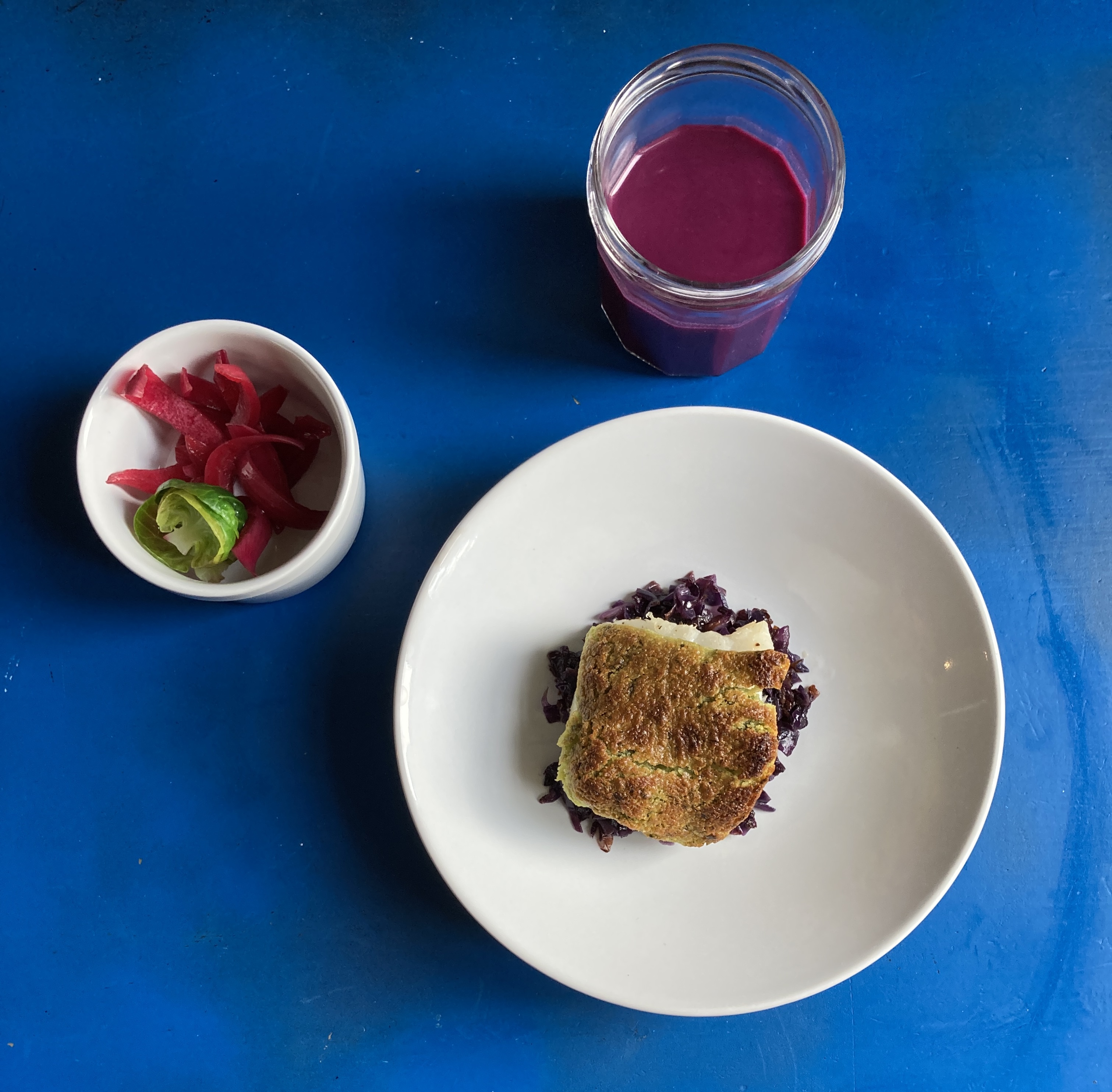 Pour la décoration, des pickles d’oignons rouges. Je t’invite à checker ça sur le site (sur la barre de recherche tu peux trouver où j’en parle). Mais normalement avec le nombre de fois que je t’en ai parlé tu sais faire maintenant. Et des pétales de choux de Bruxelles juste blanchies.
